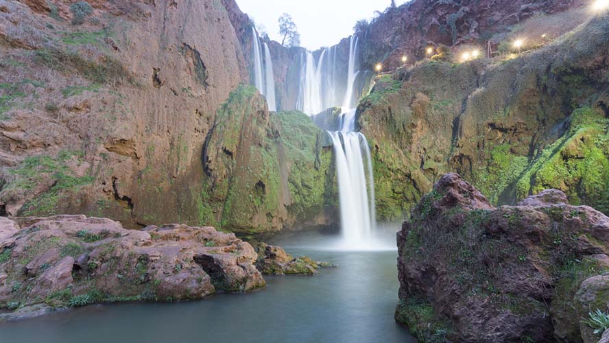 Trek through surrounding Atlas villages, meeting local Berber families and exploring terraced valleys. Picnic lunch in the mountains. Afternoon helicopter flight over the Atlas Mountains back to Marrakech. Evening: spa, hammam, and rooftop dinner.